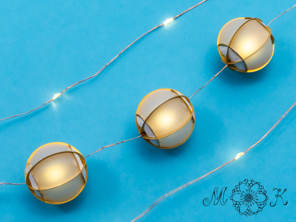 Zusätzlich habe ich ein weiteres Teil entwickelt, an das das Lämpchen in der Mitte der Kugel hält. Das raffinierte an diesem Teil ist, dass man zunächst das Grundgerüst der Kugel nach demselben Prinzip zusammenbauen kann wie beim Basis-Projekt. Anschließend wird die Kugel auf die Lichterkette gefädelt und das Lämpchen mit Hilfe des zusätzlichen Teils in der Kugel zentriert. Diese Reihenfolge ist extrem vorteilhaft im Vergleicht zu einem kompletten Zusammenbau „am Draht“.