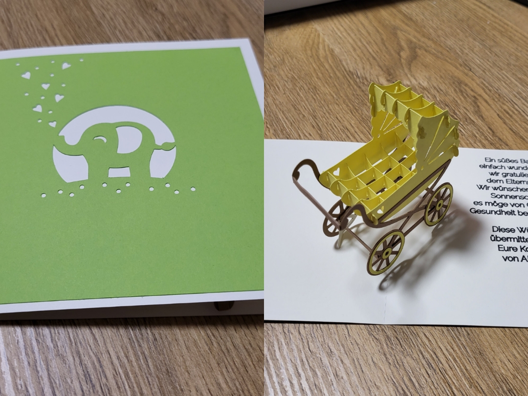 Die Karte eignet sich (in einem Kuvert) auch für den Versand per Post, da sie sich ganz flach zusammen faltet.